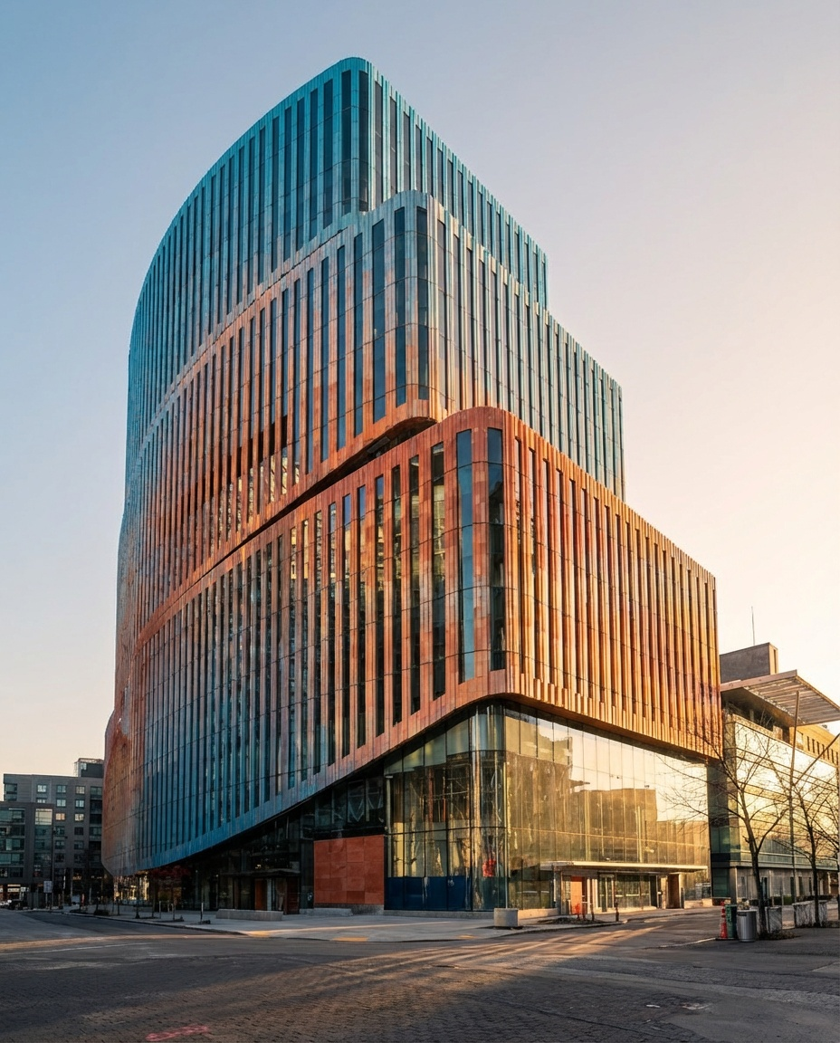 The building’s curved façades minimize shadow, leverage sunlight, mitigate wind corridors, and provide aesthetic variation. Strategic massing minimizes the façade and reduces solar gain while unlocking new open space for public use. 585 Third’s colorful, dynamic exterior is emblematic of the diverse program it houses, having been inspired by pleats found in theatrical curtains and the colors of the New England landscape.