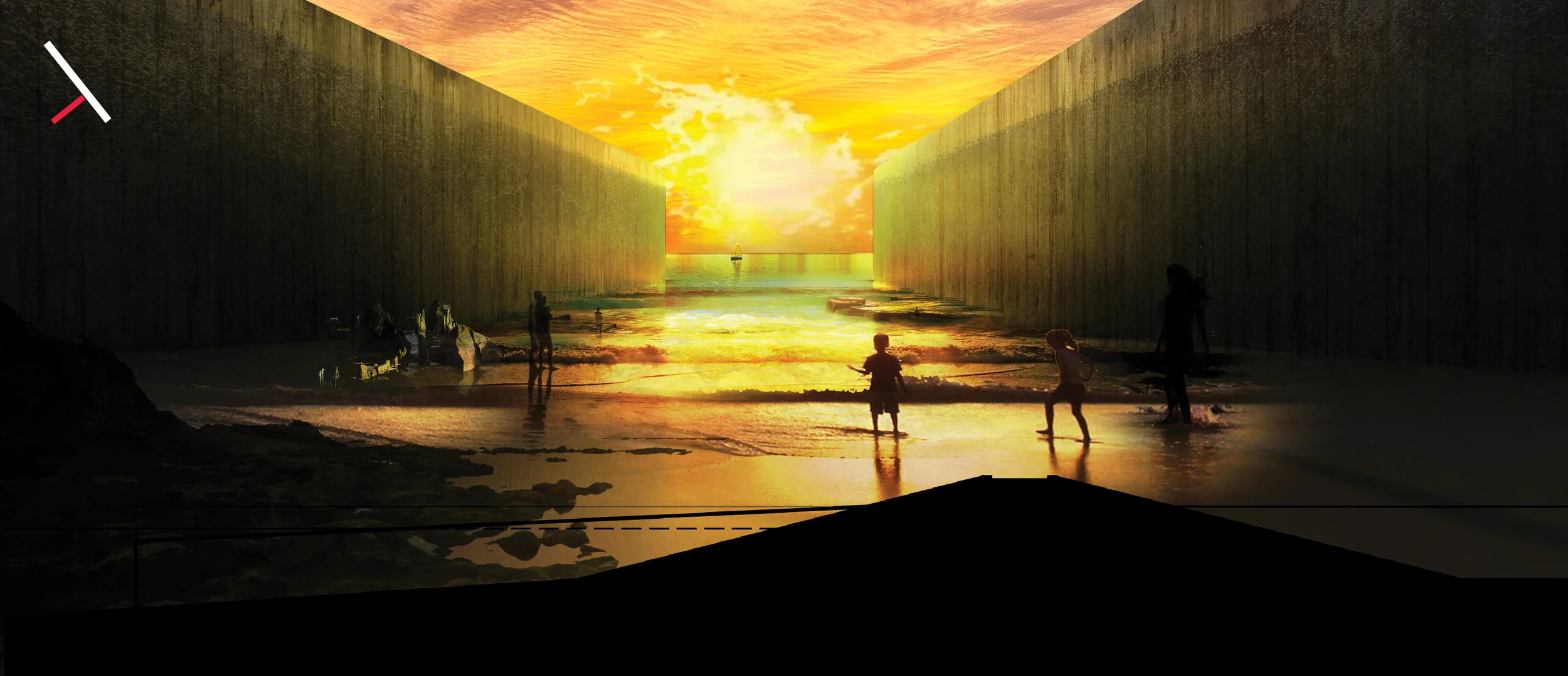 Serving as a scenic rest area, Ocean Line provides an unprecedented view of the sunset on a man-made beach. The two concrete wall becomes a frame that captures the beautiful sunset scenery while acting as a datum in which one can visualize the gradual transition of tides throughout the day.